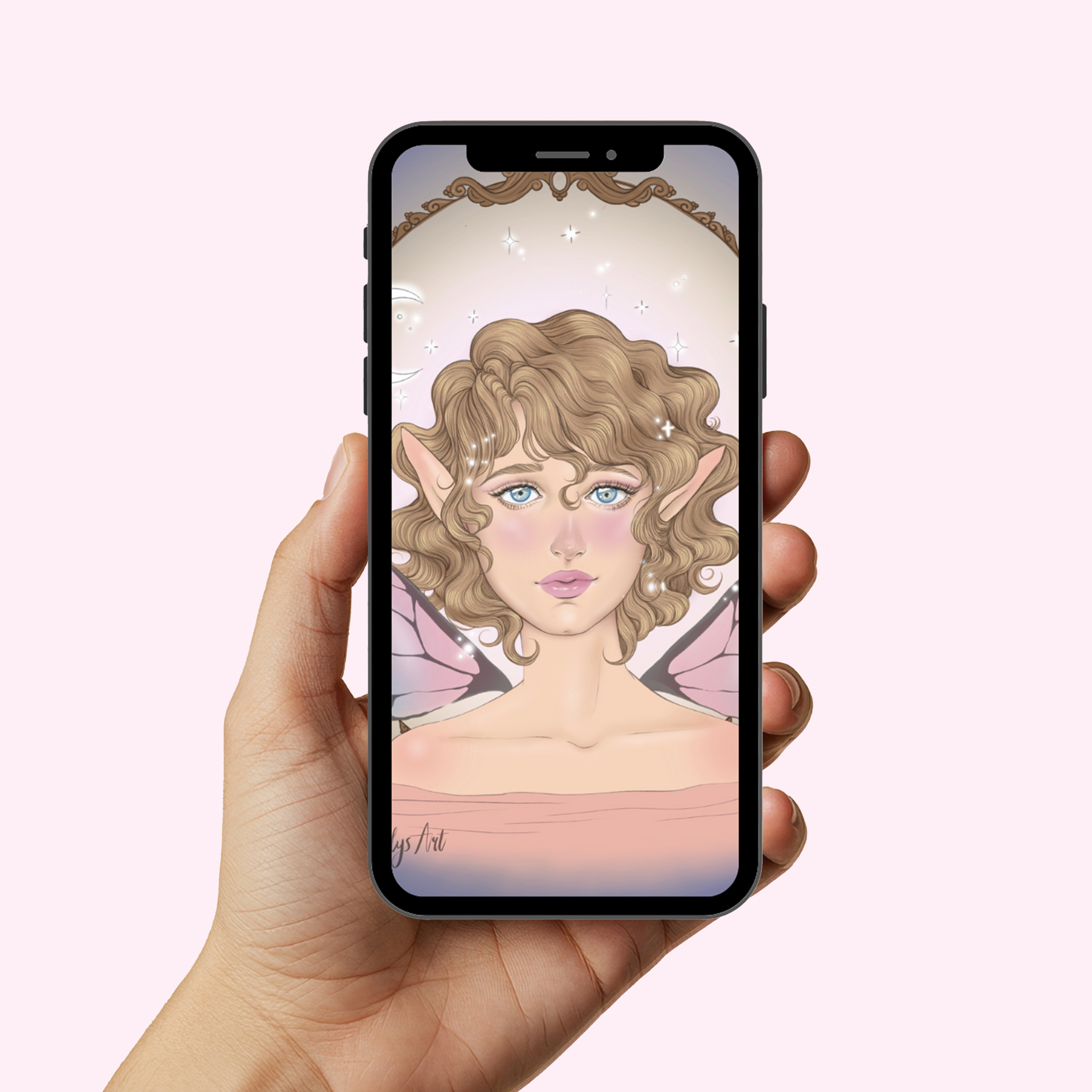 This hand-painted wallpaper features a serene fairy surrounded by gentle lights, pastel hues, and a dreamy glow that turns your phone or iPad into a calming window to a whimsical world.