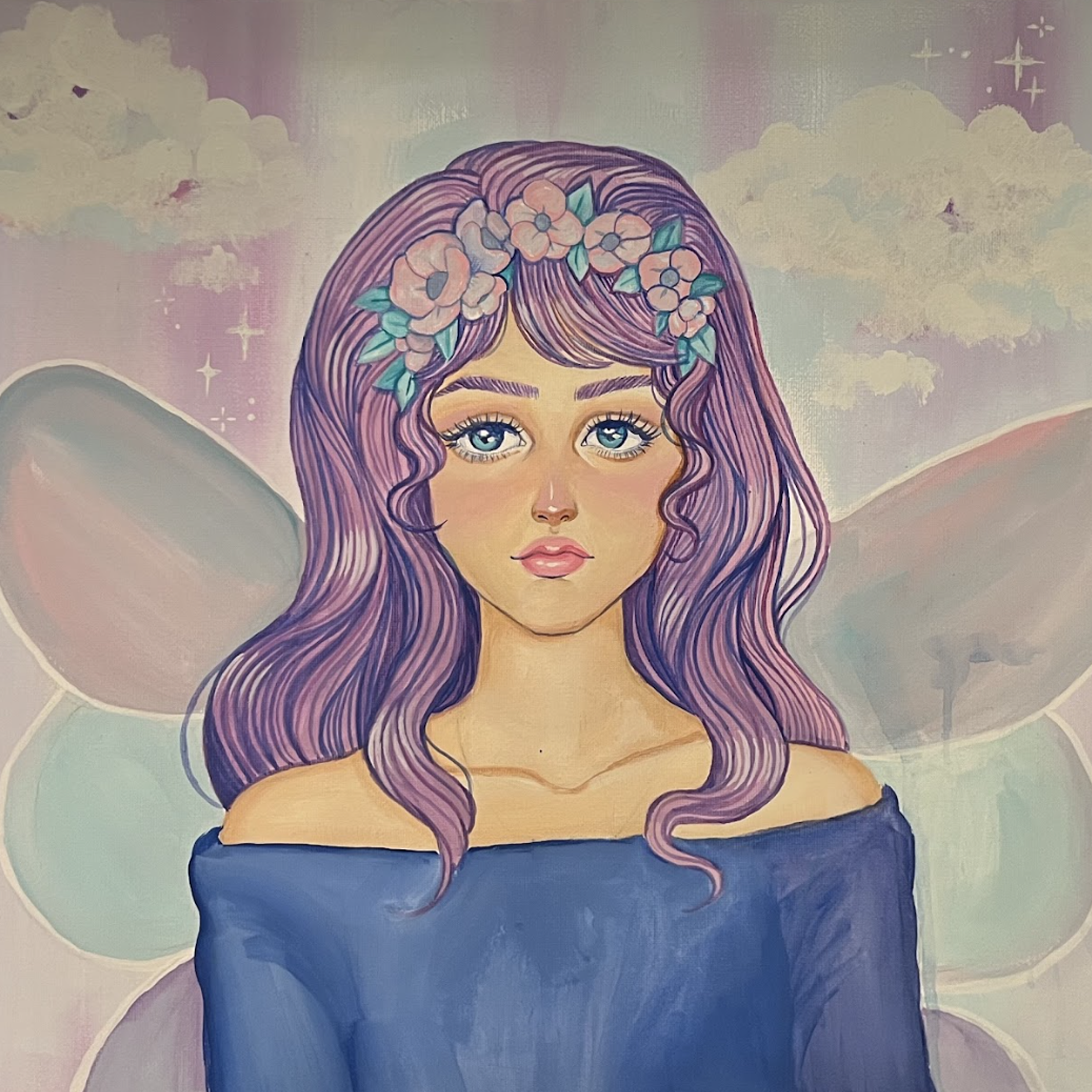 With pastel wings aglow and petals crowning her violet hair, "Hoping Fairy" drifts through a sky painted in dreams.