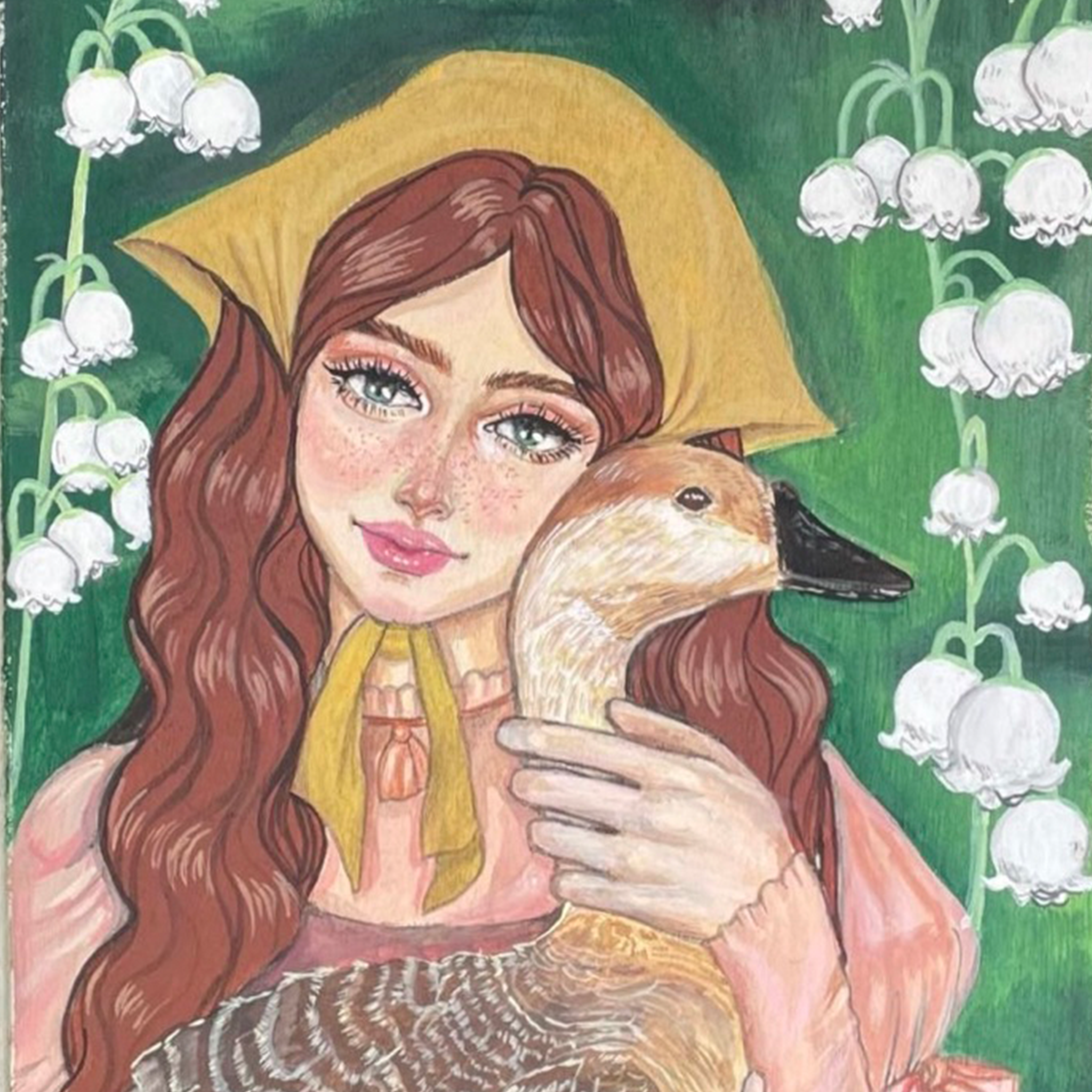 Dressed in soft hues and crowned with freckles and warmth, the maiden evokes the timeless charm of countryside grace. Her goose, calm in her arms, symbolizes loyalty and peace — a companion as devoted as the earth beneath them. Surrounding them, lilies of the valley bloom like whispered blessings, filling the air with innocence and purity.