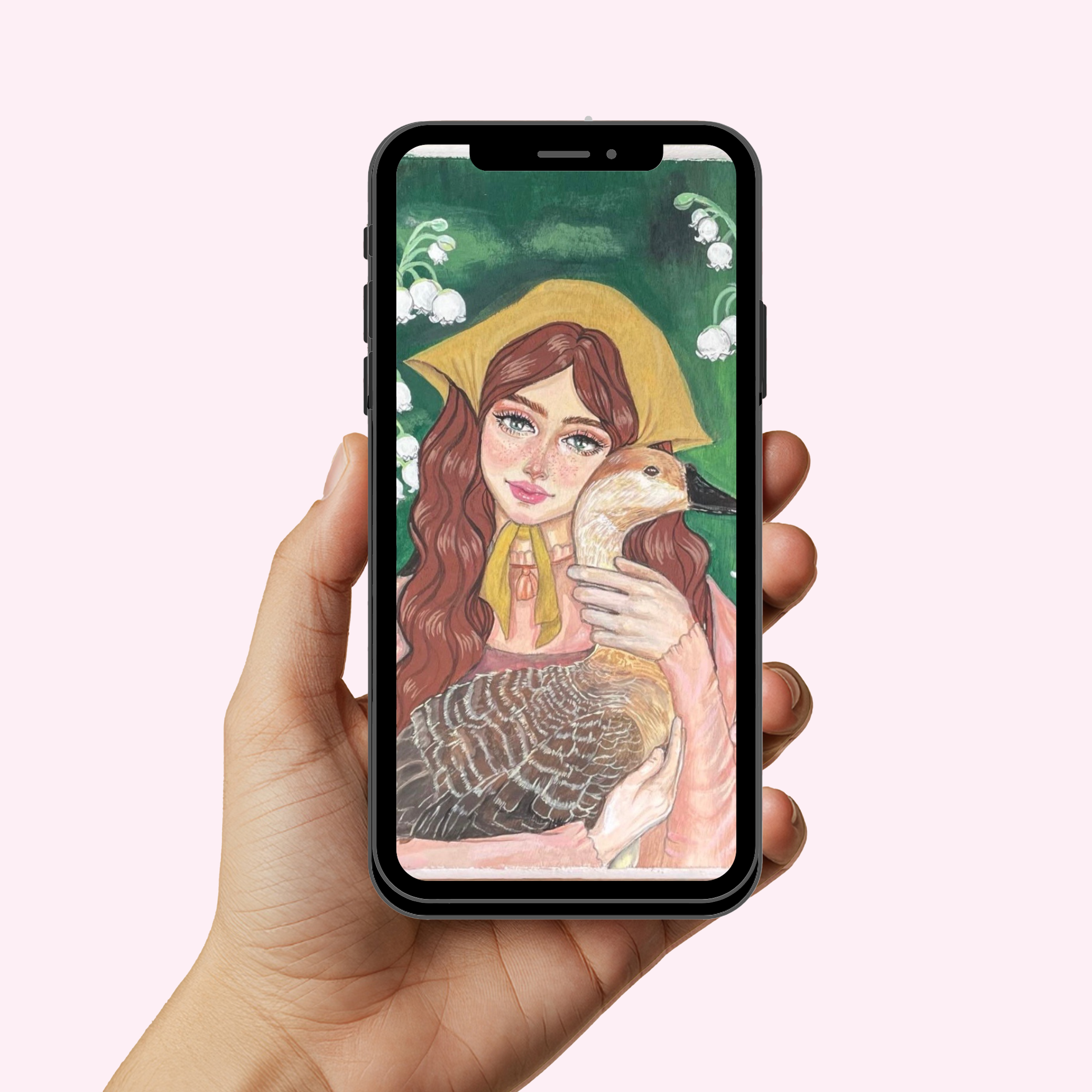 This hand-painted wallpaper features a graceful swan surrounded by delicate lily of the valley blooms, resting on a soft, dreamy background. Each glance at your phone or iPad becomes a moment of calm and quiet beauty.