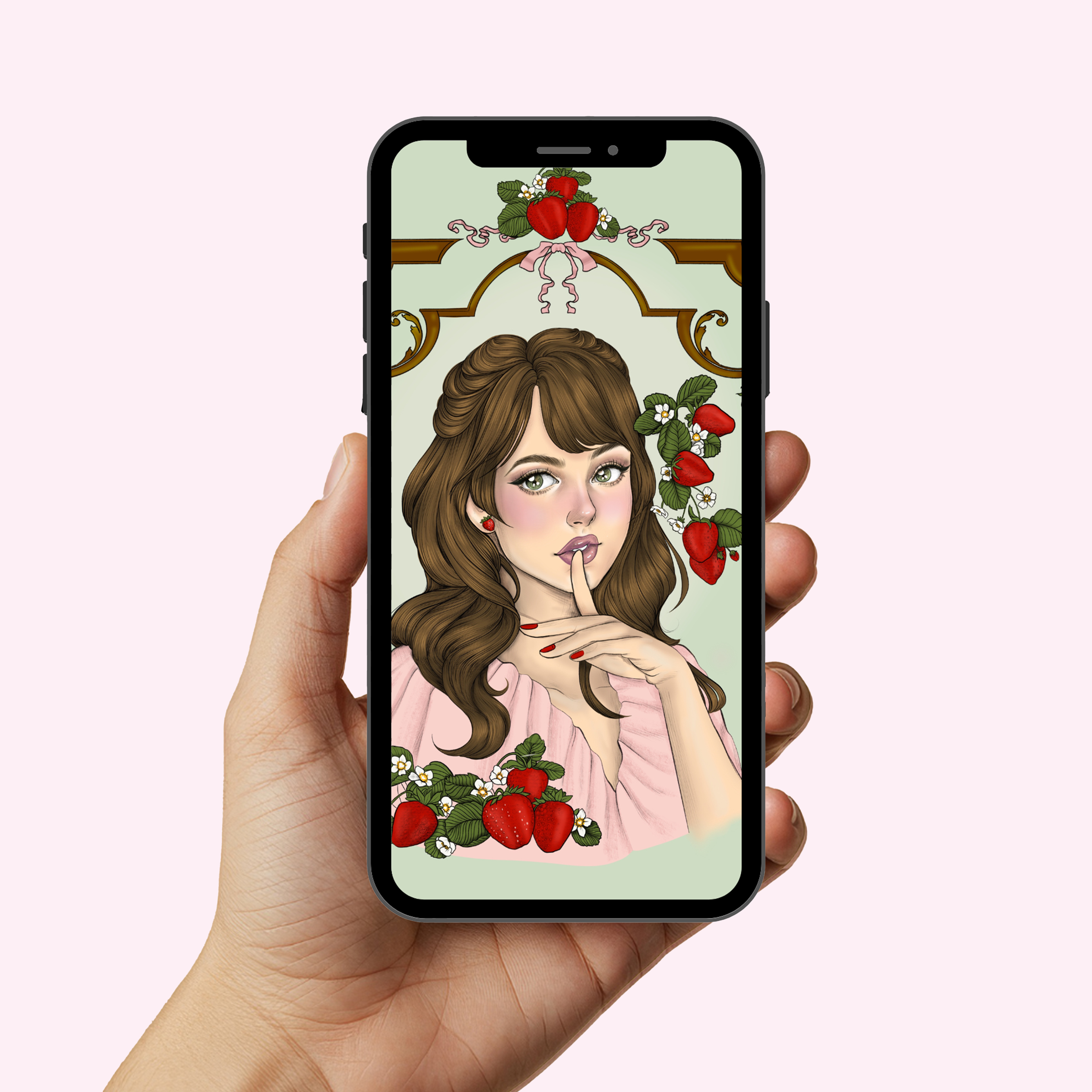 This hand-painted wallpaper features a vibrant strawberry against a calming green backdrop, adding a cheerful yet soft aesthetic to your phone or iPad.
